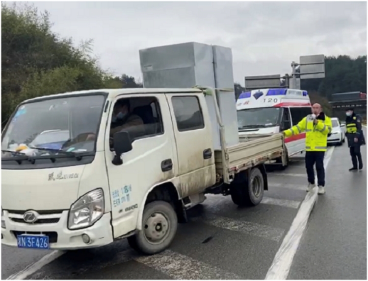 安江收費(fèi)站副站長(zhǎng)胡玨在收費(fèi)廣場(chǎng)引導(dǎo)車(chē)輛,幫助載有重癥病人的救護(hù)車(chē)快速通過(guò)。