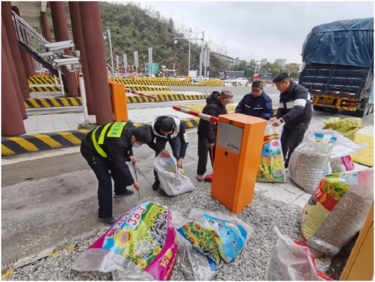 貨車(chē)經(jīng)過(guò)懷化南收費(fèi)站時(shí),車(chē)上瓜子大量?jī)A瀉,收費(fèi)班長(zhǎng)周明生組織人員幫忙清理。